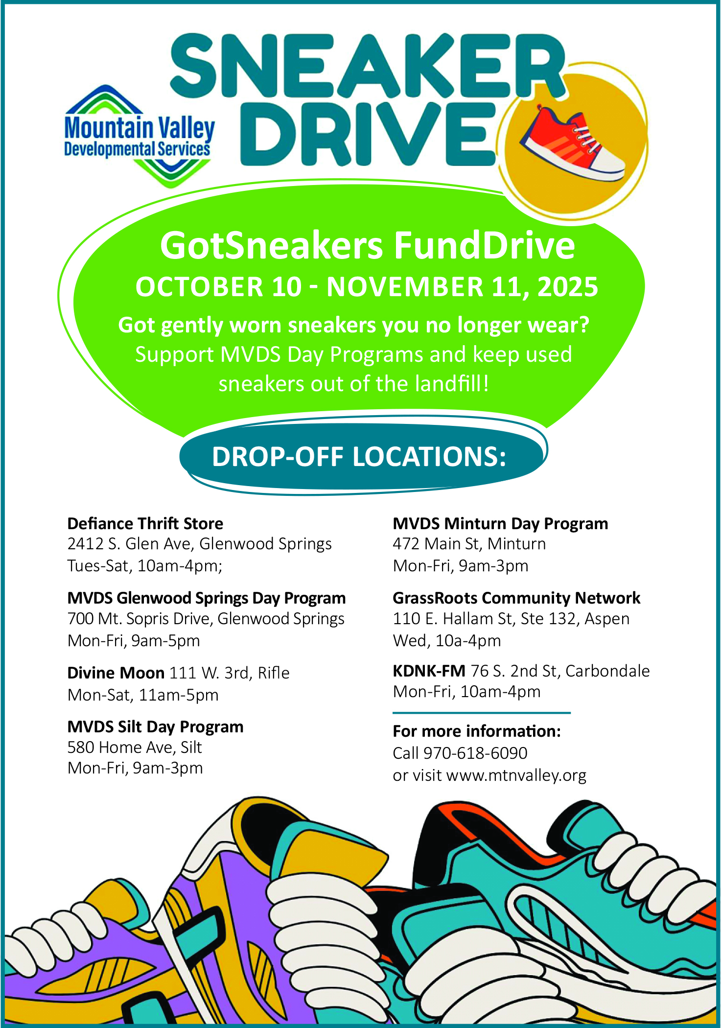 Mountain Valley Developmental Services, Inc. is holding an athletic shoe drive fundraiser until Nov 11, 2025 to raise money for its Day Programs in Glenwood Springs, Silt and Minturn. MVDS will earn funds based on the total quantity of gently worn, used, and new sneakers (only) collected, and this first year has a goal of collecting 500 pairs. The