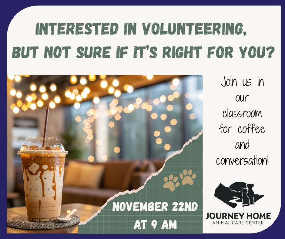 Join us in our classroom on November 22nd at 9am, and have the chance to speak with our Community Outreach Coordinator Nicole Coffin! Learn all about the different volunteering options with Journey Home, and ify you're interested then you can get signed up to volunteer with us on the spot!