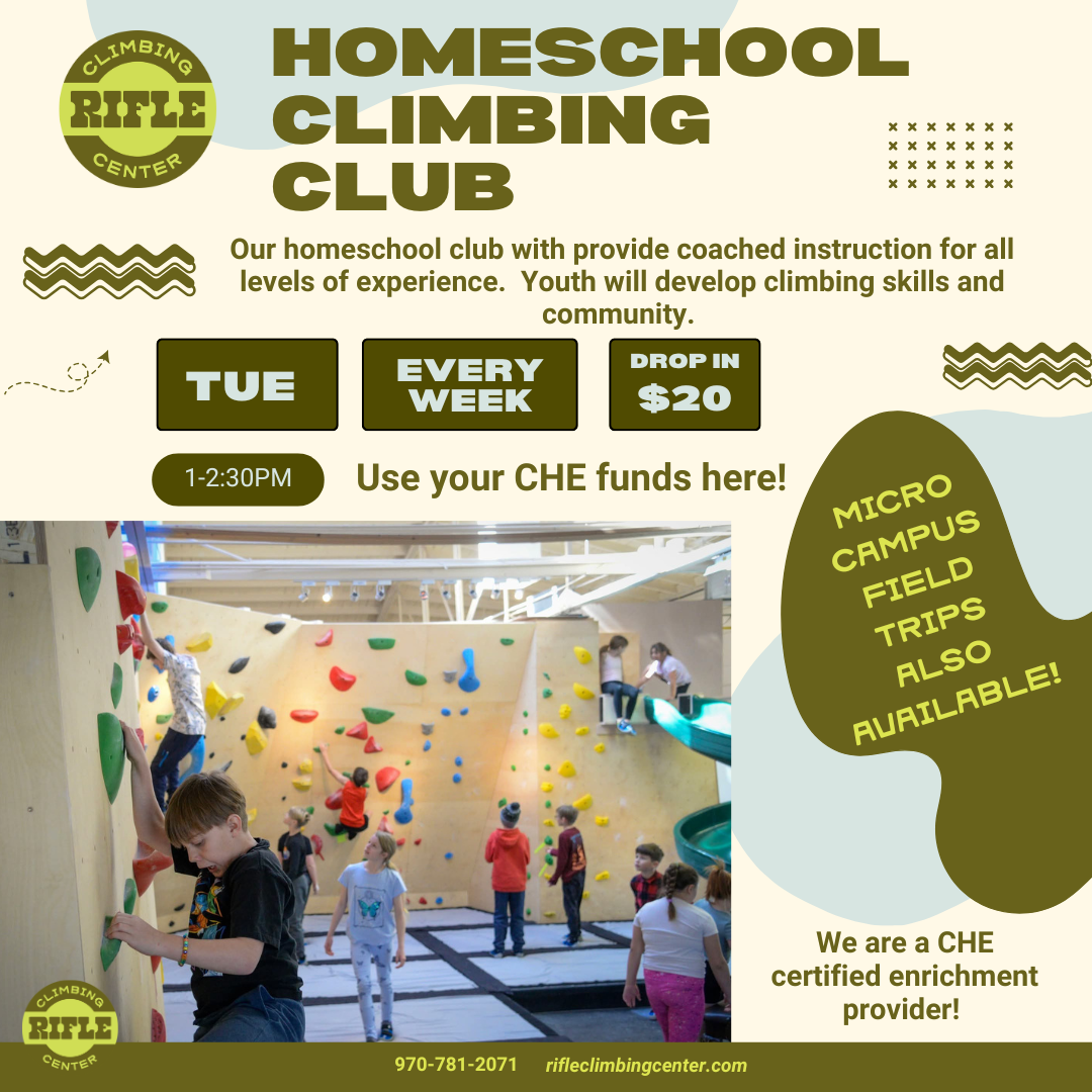 We're excited to launch a brand new Homeschool Climbing Club at Rifle Climbing Center - a fun, active, and social way for kids to connect, learn new skills, and burn energy.