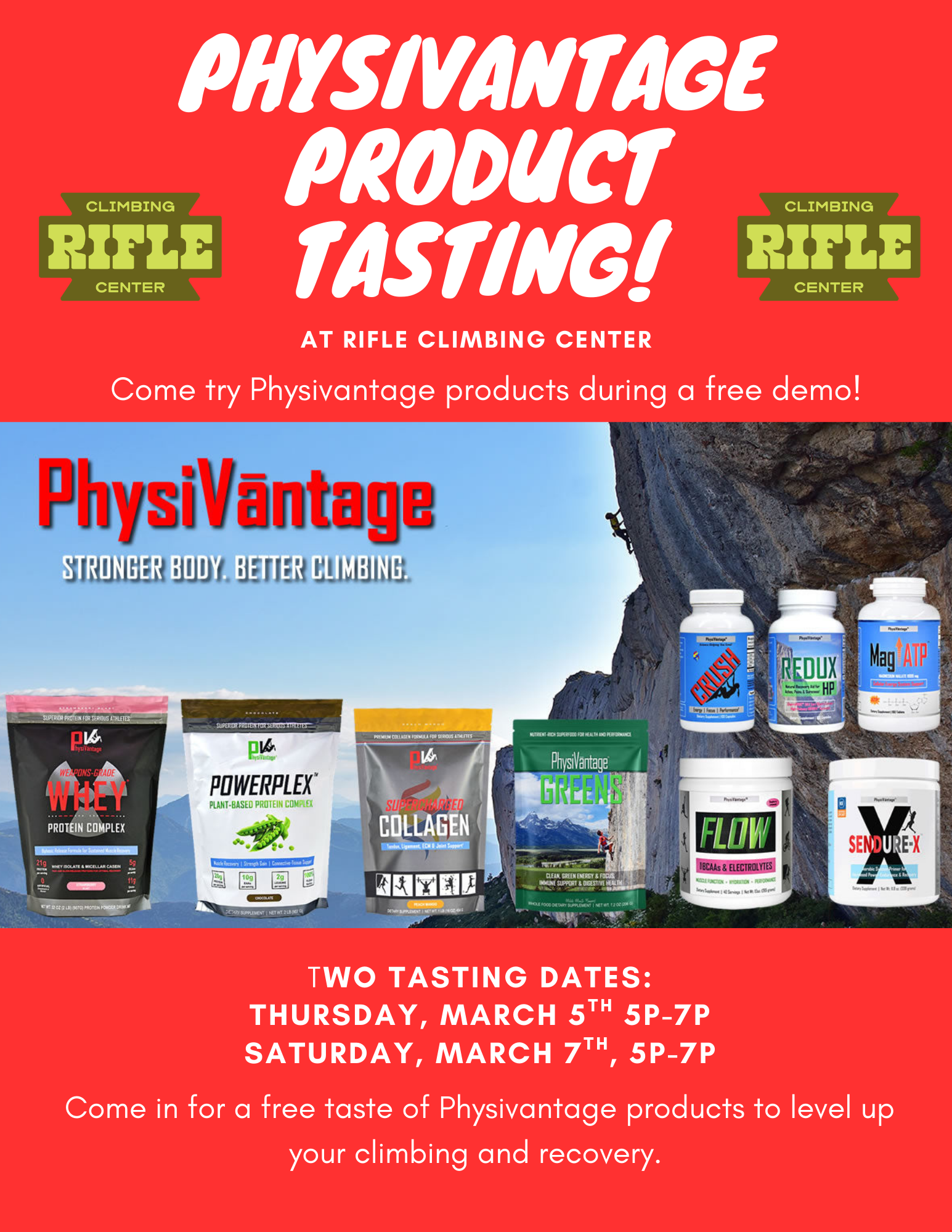 As part of our 1st Anniversary Weekend Celebration, we’re hosting two FREE Physivantage product tastings - open to the public! Come sample climbing-focused supplements designed to support performance, endurance, and recovery.