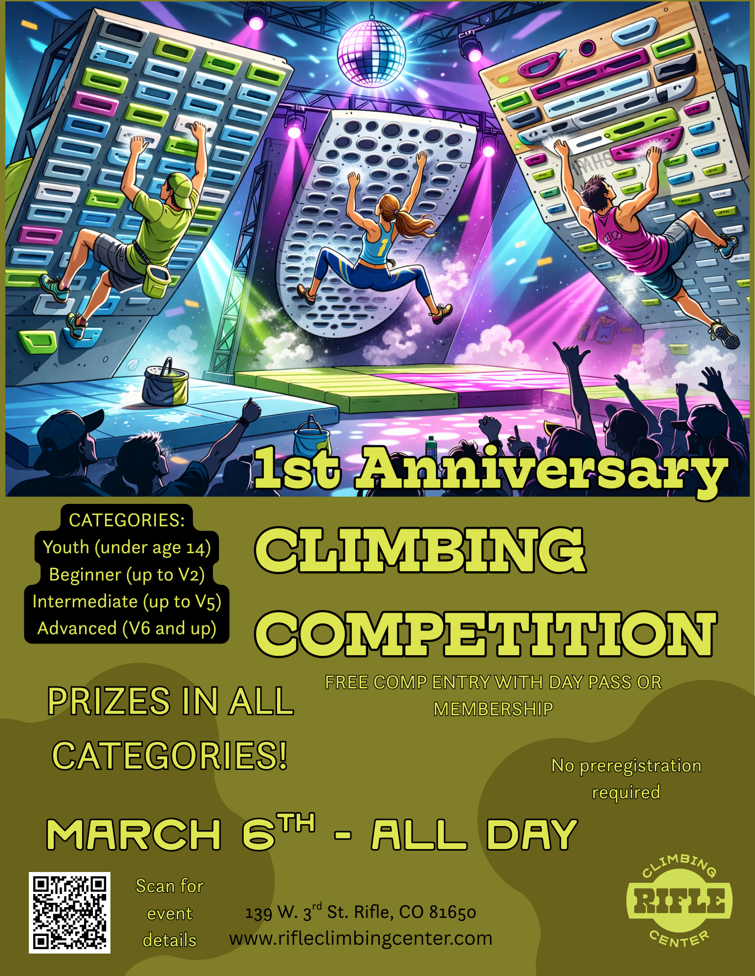 This competition is part of our 1st Anniversary Weekend Celebration, packed with events, climbing, and community all weekend long. Check out the full schedule here: