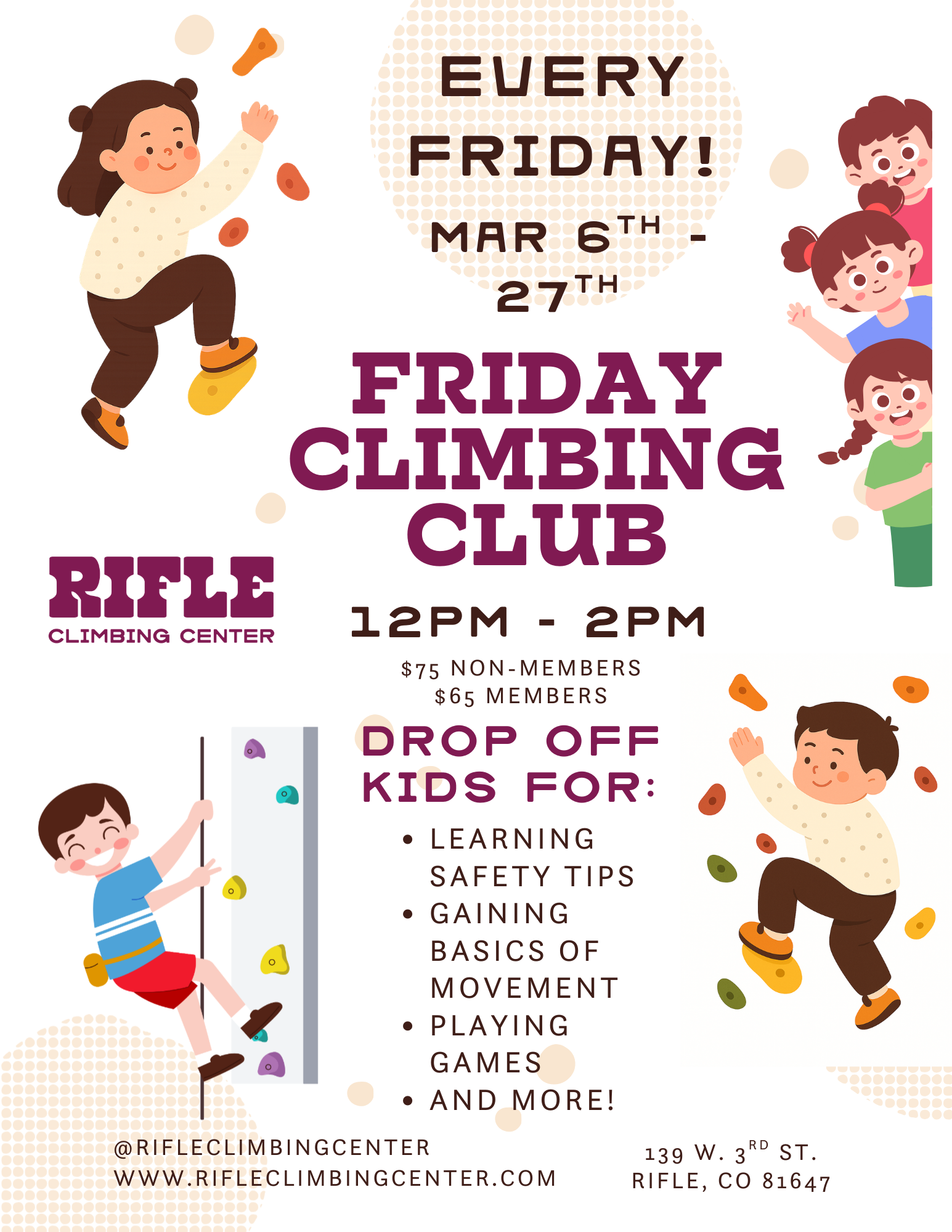 Looking for a fun, active Friday drop-off for your kiddo? Bring them to Rifle Climbing Center for our Friday Climbing Club, running every Friday from March 6–27, 12–2 PM.