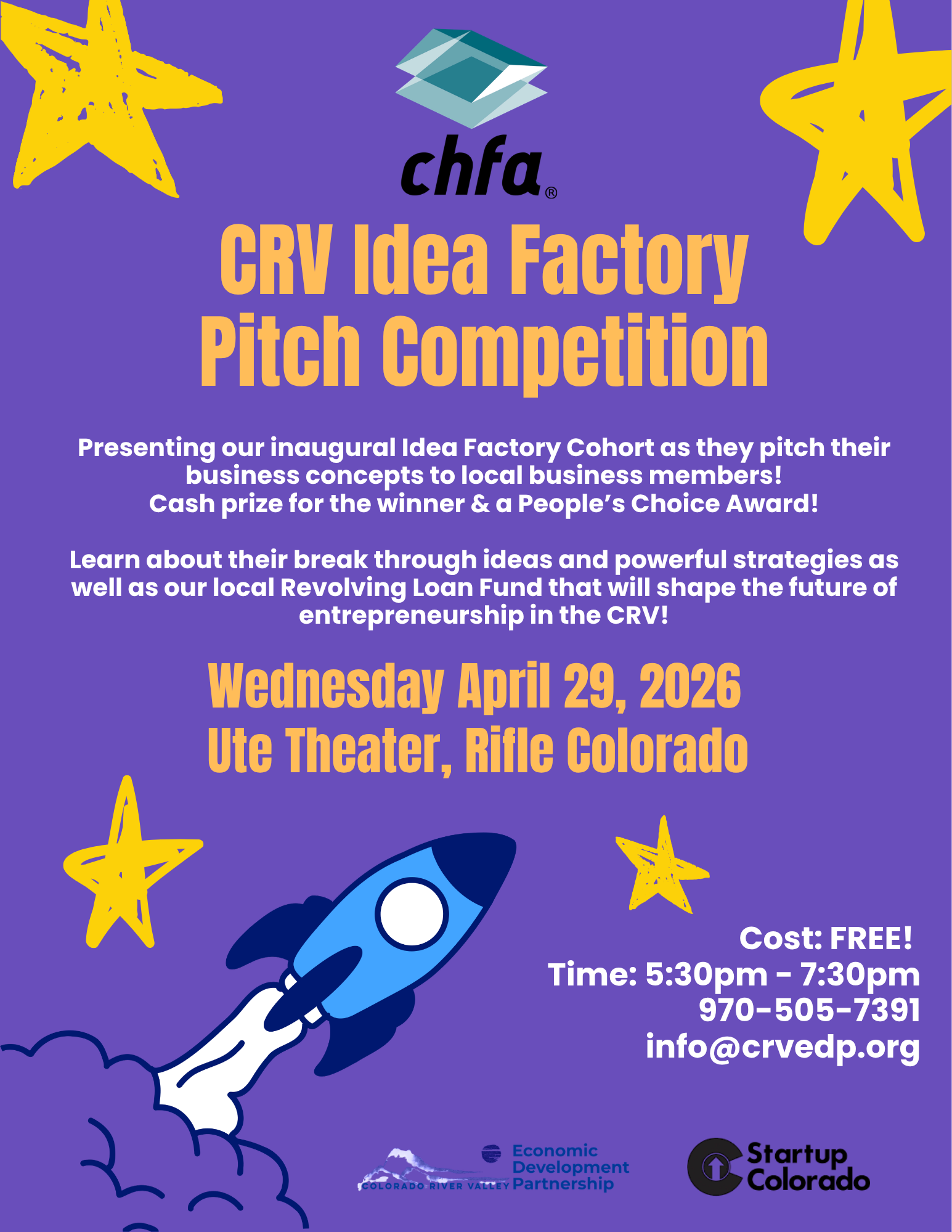 Attendees will hear innovative pitches, learn about local entrepreneur resources—including the Revolving Loan Fund—and help select the People’s Choice Award winner. The top pitch will receive a $1,000 cash prize, sponsored by CHFA.